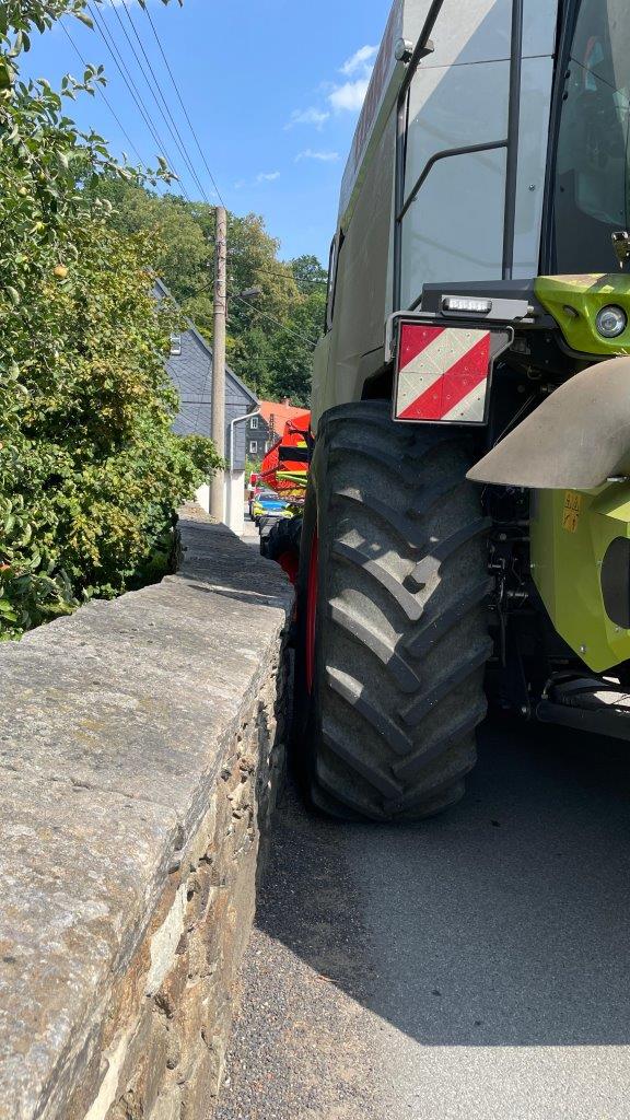 Riesige Mähdrescher erleben wir meistens gemeinsam mit einem Begleitfahrzeug und gelber Rundum-Warnleuchte. Aber, es gibt auch wirklich sehr seltsame Vorfälle, die dann zu einem Einsatz der Feuerwehr führen können. So auch am 15. August vor 14.00 Uhr, als ein Mähdrescher mit angehängtem Schneidwerk ohne „Geleitschutz“ aus der Richtung Niederdorf in die David-Goldberg-Straße eingefahren war. Diese an sich schon ziemlich schmale Anliegerstraße verengt sich auf Höhe der Hausnummer 22, und der Fahrzeugführer überfuhr und beschädigte eine Vorgartenmauer aus Sandstein. Weiter oben wird diese Straße noch enger. Die Polizei wurde hinzugezogen und forderte über die IRLS Ostsachsen technische Hilfe an. Die Gemeindefeuerwehr unter Führung von Einsatzleiter Thomas Schaaf stellte bei ihrem Eintreffen um 14.05 Uhr fest, dass der Mähdrescher mit angehängtem Schneidwerk in der David-Goldberg-Straße nicht zurücksetzen konnte. Infolge einer Entscheidung durch die Polizei wurde daraufhin ein Teil des Gartenzaunes auf Höhe David-Goldberg-Straße 20 durch die Feuerwehr entfernt. Anschließend wurde der Mähdrescher durch die Engstelle eingewiesen und konnte diese schließlich verlassen. Um 16.00 Uhr war der Einsatz beendet. Die berechtigte Frage nach der Ortskenntnis des Fahrers oder dem Grund für die Wahl dieser für einen Mähdrescher ungewöhnlichen Fahrtroute kann hier nicht beantwortet werden. Festzustehen scheint, dass mit etwas mehr Umsicht der entstandene Schaden und auch der damit verbundene Ärger vermeidbar gewesen wären.